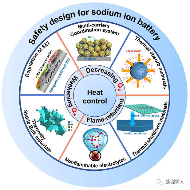 近期,武漢理工大學(xué)麥立強(qiáng)教授(通訊作者)和尤雅教授(通訊作者)從材料層面總結(jié)與分析了電池中主要產(chǎn)熱來源,熱失控過程引起的化學(xué)反應(yīng)、衡量電池安全性的重要參數(shù),并討論了為降低熱效應(yīng)電極材料的設(shè)計準(zhǔn)則。第一作者為武漢理工大學(xué)博士研究生楊超。文章主要圍繞減少電池內(nèi)部極化熱(Qp)和副反應(yīng)熱(Qs)、加快熱傳遞速率、阻燃和功能性熱保護(hù)材料做了詳細(xì)探討。該文重點關(guān)注電池的熱行為,并提出一些潛在可行的策略,這將加深對SIBs熱失控的了解,并加速熱安全體系電池材料的設(shè)計。該工作發(fā)表于材料領(lǐng)域期刊Advanced Energy Materials,題為“Materials Design for High-Safety Sodium-Ion Battery”。