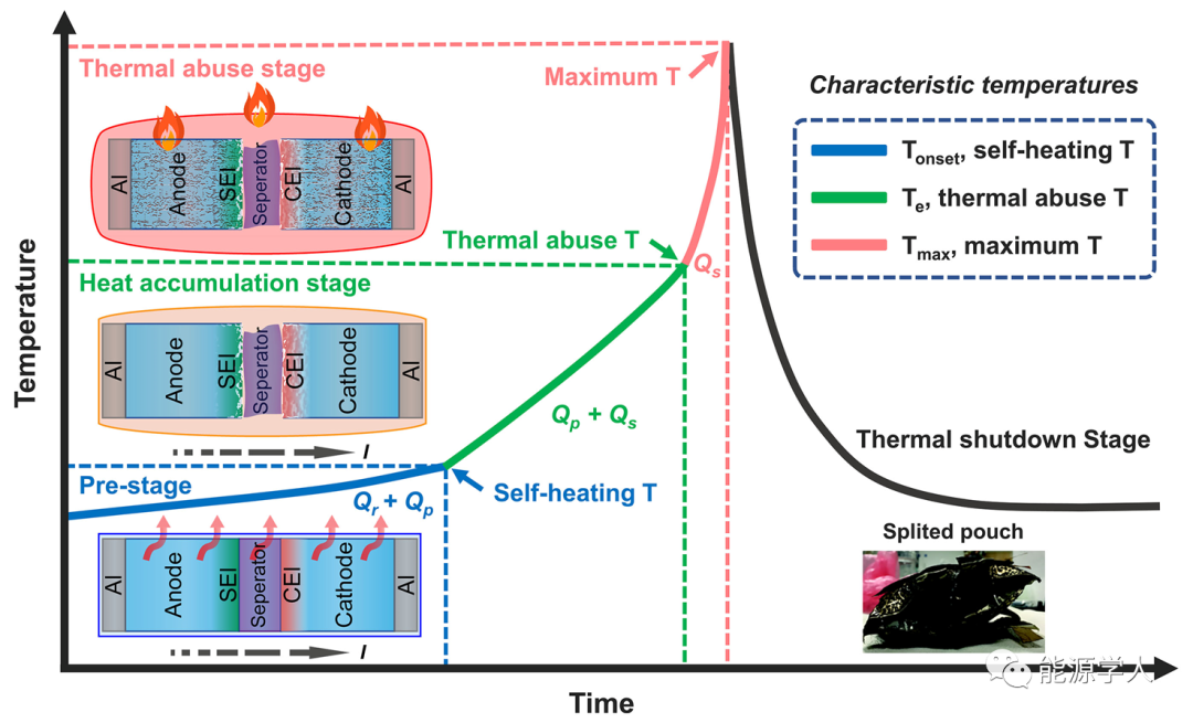 圖2 鈉離子電池?zé)崾Э剡^程的示意圖。右下插圖顯示的是熱失控之后的燒焦的鈉離子軟包電池。