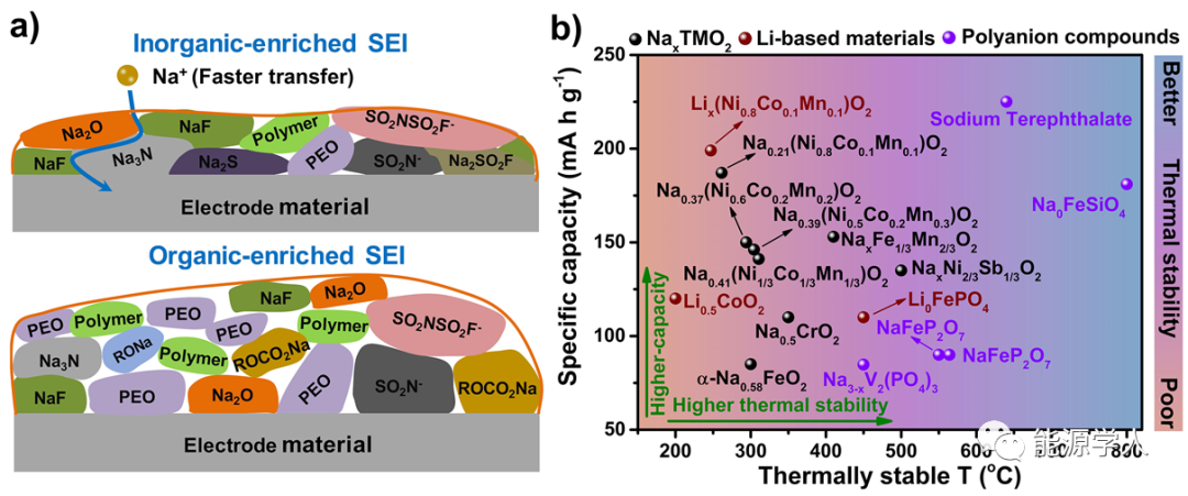圖4 a)陽極表面無機(jī)物種富集SEI(頂部)和有機(jī)物種富集SEI的示意圖。b)各種SIBs正極材料的比容量和熱穩(wěn)定性的比較(熱穩(wěn)定性數(shù)據(jù)通過DSC測定脫鈉態(tài)材料獲得)。