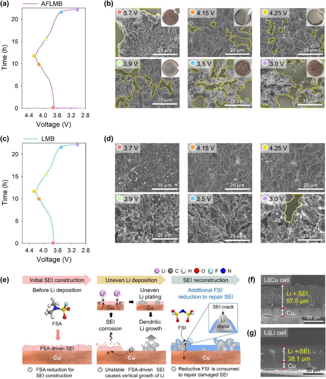 圖1. (a) 銅箔和鋰金屬陽極鍍鋰后的截面 SEM 圖。(b) 根據最低未占分子軌道(LUMO)能級以及 FSA 溶劑和 FSI-陰離子在 Cu 和鋰金屬上的吸附傾向的結果,Cu 銅箔和鋰金屬陽極在第一個周期鍍鋰前后 SEI 成分的變化示意圖。XPS 分析得出的原子百分比:(c) AFLMB 中的銅箔和 (d) LMB 中的鋰金屬陽極,在 AFLMB 首次充電期間,鍍鋰前充電至 3.7 V 和鍍鋰后充電至 4.25 V 時的對比。(e)通過比較分析(循環過程中 LiFSI 濃度的變化、LSV 和 TOF-SIMS 圖像)發現,使用 3 M LiFSI FSA 電解液的 AFLMB 和 LMB 的界面現象存在差異。