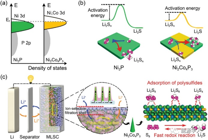 圖2. 氮空位缺陷降低多硫化物轉化能壘以及Ni3N0.85制備流程示意圖