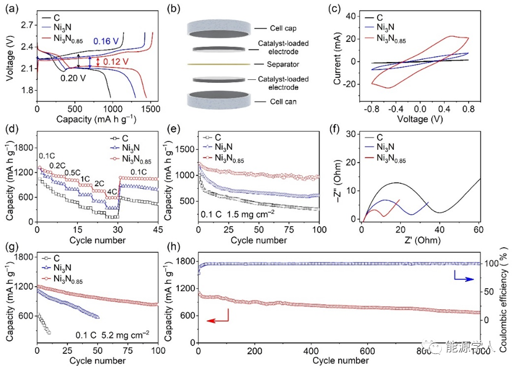 電化學性能表征如圖6所示,以0.02 C倍率充放電,添加Ni3N0.85催化劑的極化電壓僅為0.12 V,在1.5 mg cm–2負載量下,循環1000圈后的比容量保持在669.4 mAh g–1,容量衰減僅為每圈0.039%。即使在5.2 mg cm–2負載量下,依然可以穩定循環100圈。