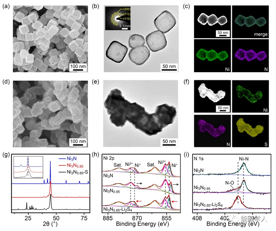 圖5. 中空Ni3N0.85負載硫前后的立方塊形貌及物相表征