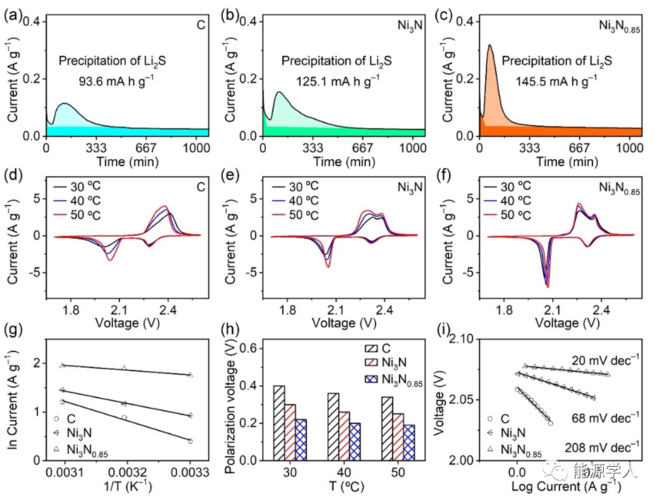 首先,如圖3a-c所示,作者通過Li2S成核實驗證明在相同過電位下,Ni3N0.85具有更優異的催化性能,同時,如圖3d-f所示,變溫CV測試結合阿倫尼烏斯方程可推導出Ni3N0.85中的多硫化物轉化能壘僅為8.11kJ mol–1,實驗證明了Ni3N0.85具有優異的催化性能。