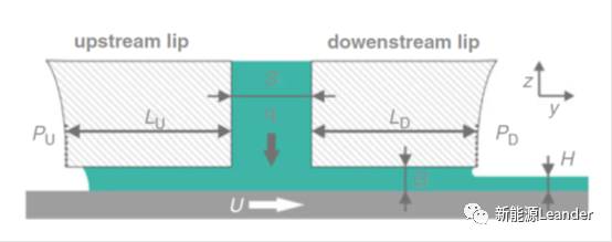 影響極片涂層厚邊現(xiàn)象產(chǎn)生的因素主要有幾個(gè)方面:(1)涂布模頭的幾何特征及涂布工藝參數(shù),模頭擠壓涂布流場(chǎng)示意圖如圖4所示,模頭幾何參數(shù)和涂布工藝參數(shù)包括狹縫尺寸S、模頭出口漿料流量q、模頭與涂輥間隙尺寸G、涂布速度U、涂層濕厚H等;(2)漿料的性質(zhì),特別是漿料表面張力。