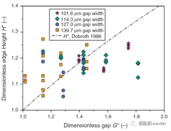 式中,q為漿料體積流量,H為涂層濕厚,G為涂布間隙。因此,厚邊涂層厚度與無(wú)量綱涂布間隙G*相關(guān)。