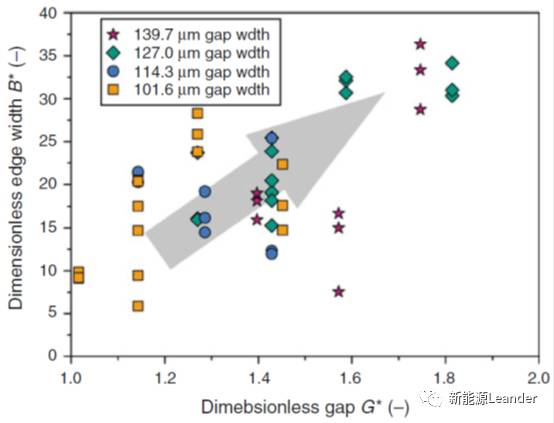 圖6為無(wú)量綱涂布間隙G*與厚邊無(wú)量綱厚度H*的實(shí)驗(yàn)數(shù)據(jù)圖和公式預(yù)測(cè)關(guān)系,根據(jù)經(jīng)驗(yàn)公式,涂布間隙增加時(shí)厚邊厚度相應(yīng)增加,但是從實(shí)驗(yàn)數(shù)據(jù)來(lái)看相關(guān)性不是特別大。而隨著涂布間隙增加,厚邊涂層的寬度增加,如圖7所示。因此,減低涂布間隙是抑制厚邊現(xiàn)象的一個(gè)有效措施。